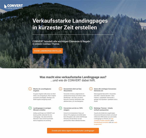 Tausche die Inhalte der vorgefertigten Conversion-Elemente einfach und schnell mittels des CMS Contao aus und erstelle Landingpages zu Themen, wie App vorstellen, Produkt verkaufen, deine Dienstleistung vermarkten oder um Leads zu generieren.